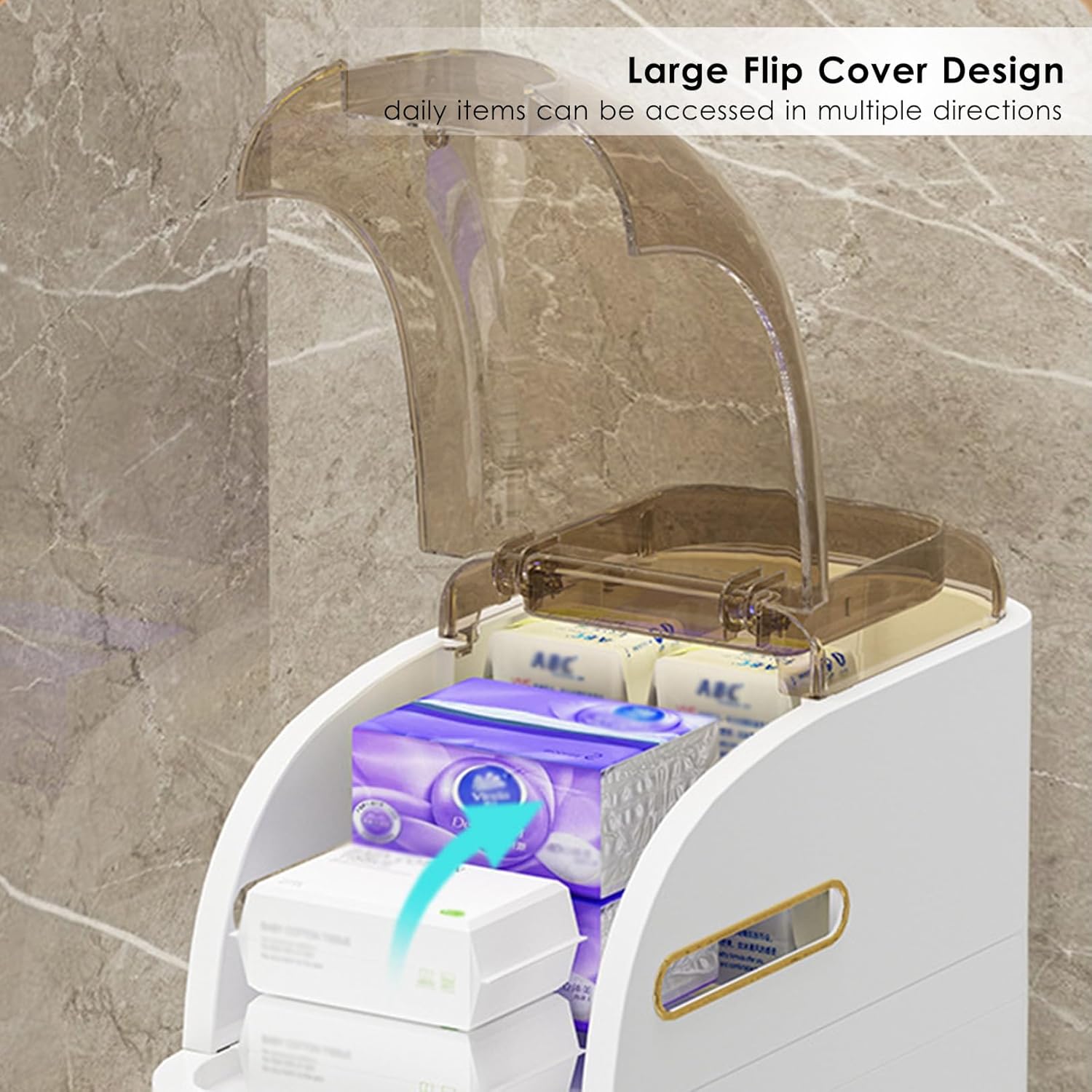 - LARGE STORAGE SPACE: This bathroom storage nicer has a large storage space. The top of the cabinet is open to store small items. The flip top allows easy access to toilet paper and cleaning supplies. The lower cabinet with drawers can store tall bottles and other tall items.